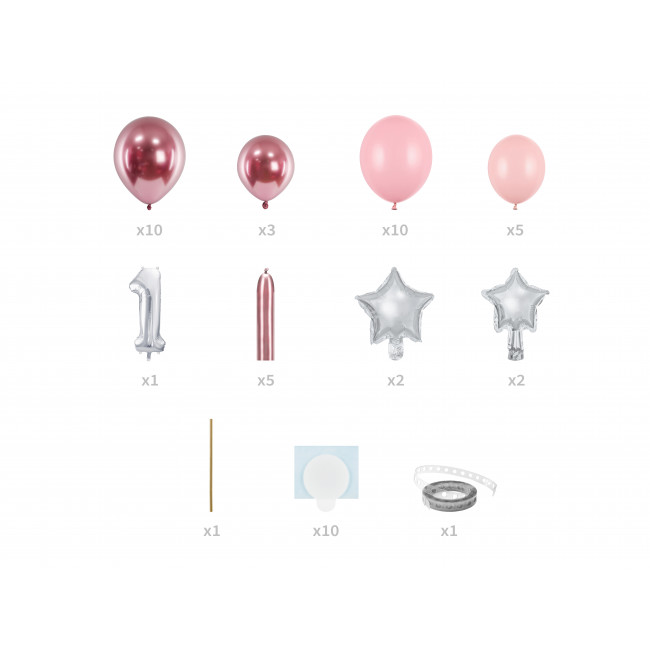 Tot ce aveți nevoie pentru a crea această minunăție se găsește într-un singur pachet. Pentru a umfla baloanele, vă recomandăm să folosiți heliu pentru un efect de plutire sau o pompă manuală practică. Acest set este soluția completă pentru decorul dumneavoastră festiv.